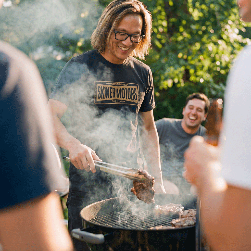 Easy to throw on with jeans, shorts or work pants, it’s the go-to shirt when you want everyone to know you roll with the Skwer Motors family.