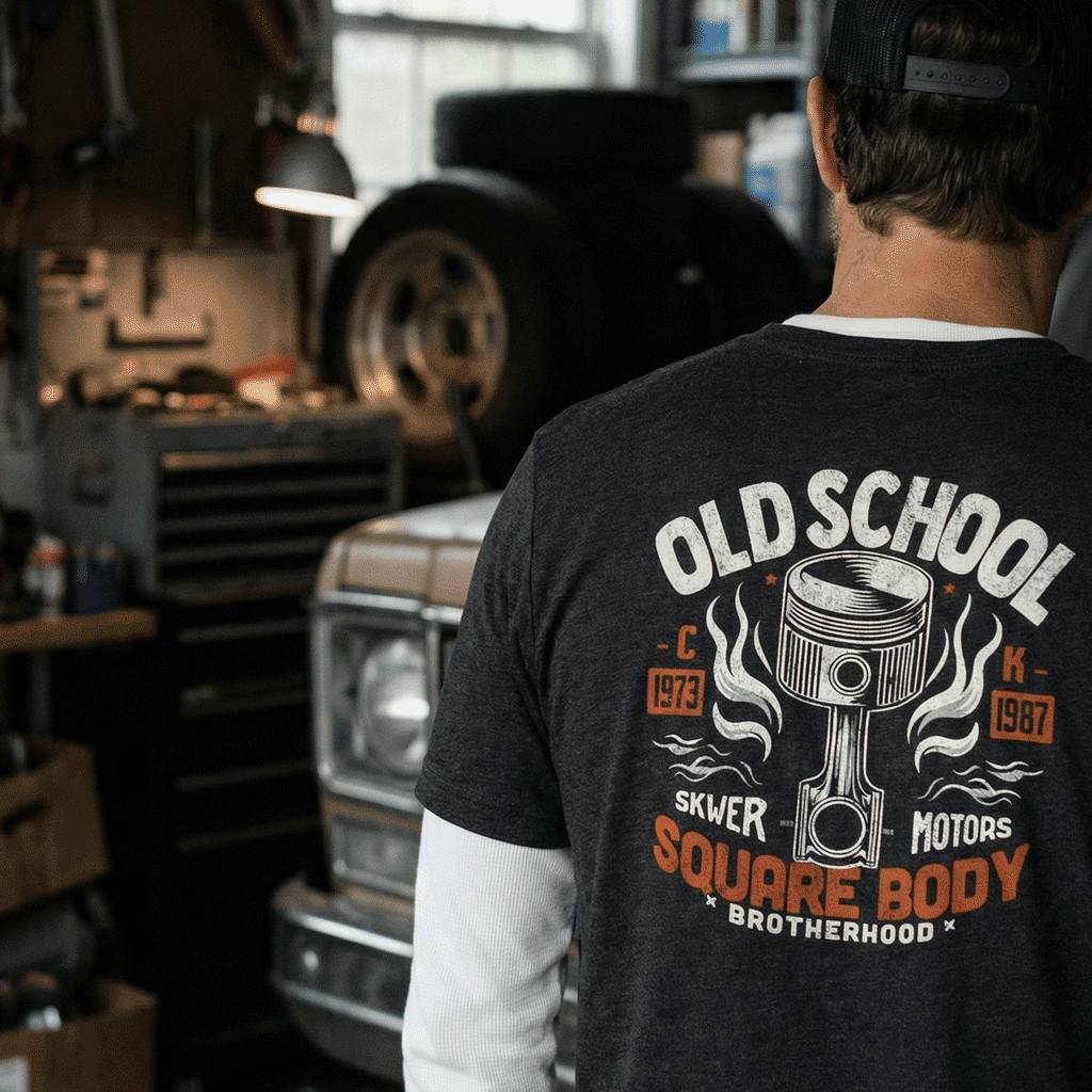 Made for old-school Chevy C/K and Squarebody fans who still believe in pistons, carburetors and real truck brotherhood, this tee puts a bold “Old School – SquareBody Brotherhood” design on both the front and back.